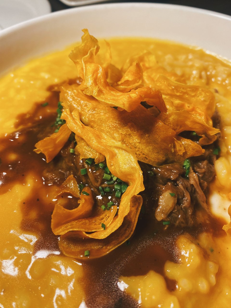 Αν πρέπει να συνοψίσω τη δυναμική του νέου μενού και τον γευστικό του χαρακτήρα, σε ένα από όλα τα νέα πιάτα που δοκίμασα, θα επιλέξω μακράν το ριζότο κολοκύθας: ένα πιάτο με βαθιά νοστιμιά, με τον ξεψαχνισμένο μαύρο χοίρο που έχει σιγομαγειρευτεί να απογειώνει το ριζότο που σερβίρεται διανθισμένο με flakes γλυκοπατάτας, σε μια μικρή γαβάθα, όπως αξίζει σε ένα χειμωνιάτικο comfort food. Eίναι σαν πίνακας που απεικονίζει τη μαγεία της ελληνικής υπαίθρου το φθινόπωρο. Λιχούδικο, αρμονικό, ισορροπημένο και πλούσιο γευστικά, το ριζότο αυτό είναι κατά τη γνώμη μου ο πυρήνας σε αυτό το νέο μενού.