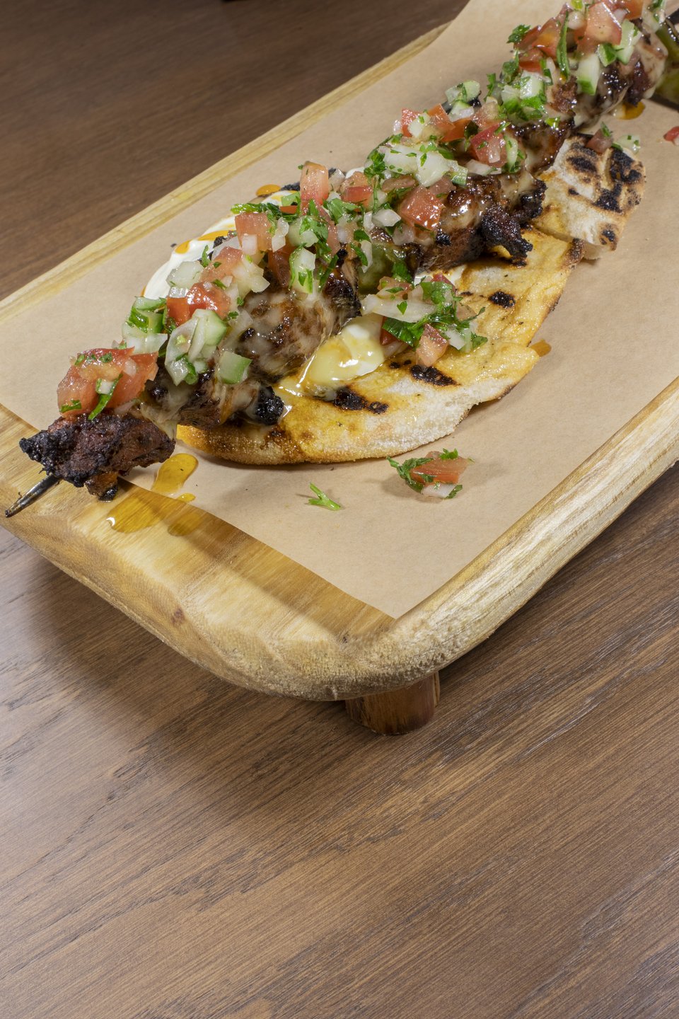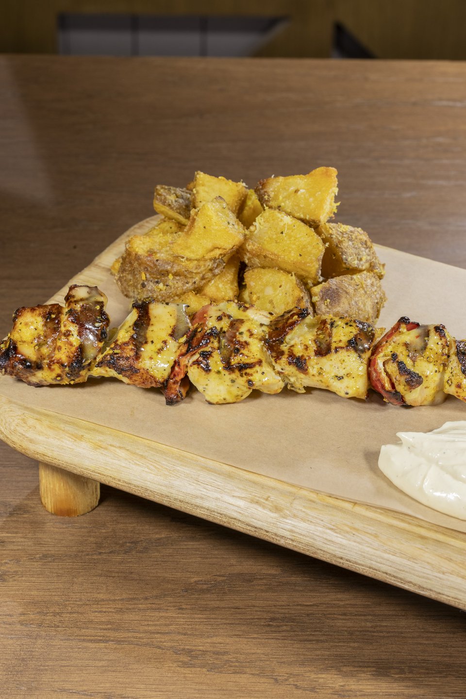 Το κοτόπουλο με τις τριπλομαγειρεμένες -κολασμένες- πατάτες και το ζουμερό κοντοσούβλι μαύρου χοίρου με χειροποίητο flatbread, γιαούρτι και pico de gallo.