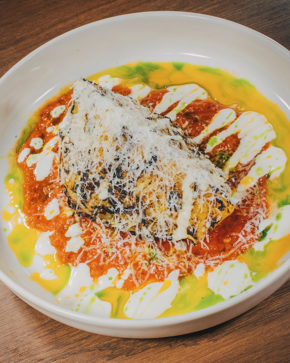 Το ψητό λάχανο με την πικάντικη σάλτσα ντομάτας, το γιαούρτι με ταχίνι, την παλαιωμένη γραβιέρα Τήνου, είναι από αυτά που δοκιμάζεις μια πιρουνιά και μετά συλλαμβάνεις τον εαυτό σου να μαζεύει τη σάλτσα από το γιαούρτι και τα λάδια μυρωδικών και πάπρικας με το τελευταίο καψαλισμένο φύλλο λάχανου που έχει απομείνει στο πιάτο. Σου φέρνει στο νου τους λαχανοντολμάδες της μαμάς σου, χωρίς κρέας, αλλά ταυτόχρονα είναι τόσο πρωτότυπο πιάτο που ξεχωρίζει.