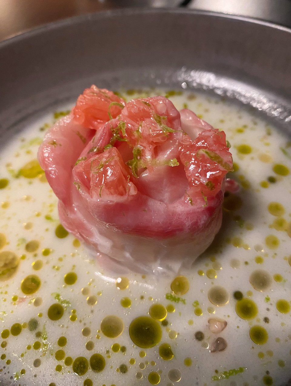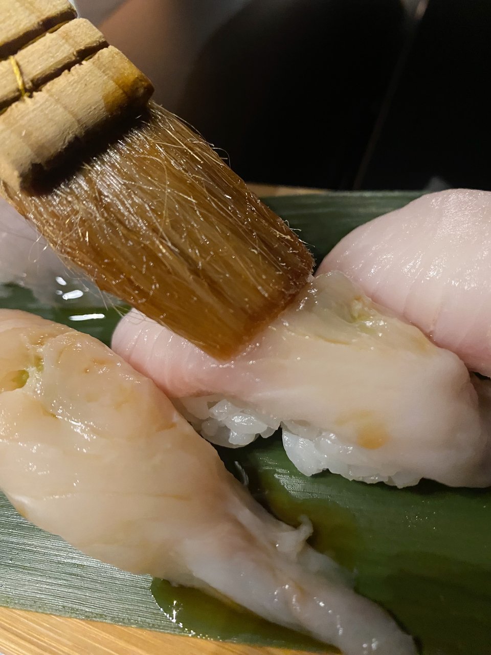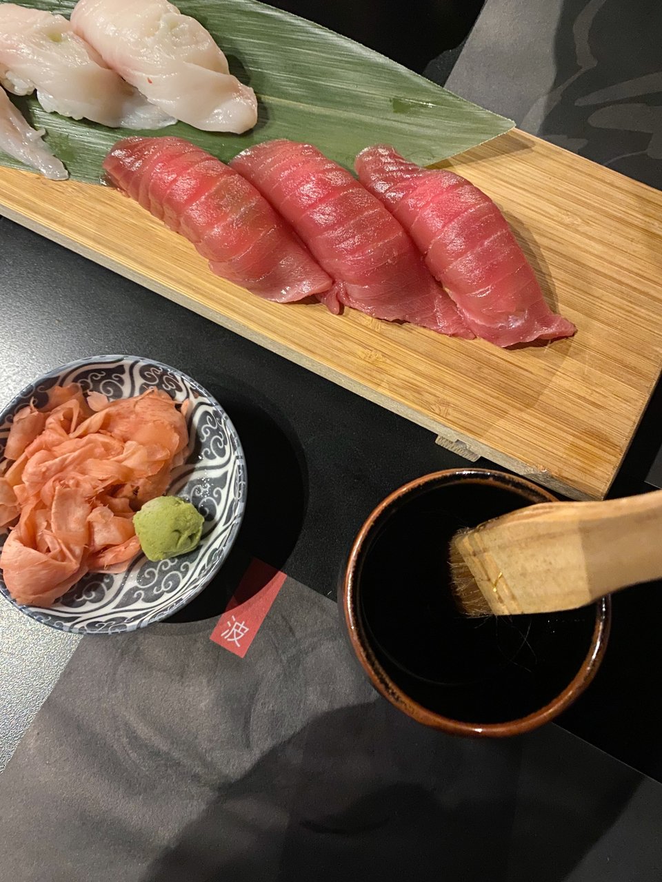 Συνεχίσαμε με nigiri τόνου, μαγιάτικου και τσιπούρας με λάδι τρούφας και ροζ πιπέρι.
