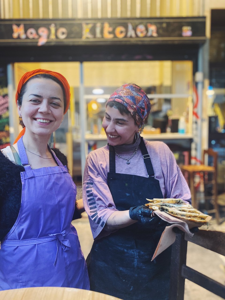 Το Magic Kitchen σερβίρει σε τραπεζάκια στο πεζοδρόμιο κάτι λεπτές τραγανές πίτες με γιούφκα, ένα ακαταμάχητο χειροποίητο φύλλο που ανοίγεται επιτόπου μπροστά μας στην κουζίνα. Οι πίτες αυτές, τα φημισμένα τούρκικα γκιοζλεμέ (gözleme), σερβίρονται σε διάφορες παραλλαγές: γεμισμένες με χόρτα (σπανάκια, πράσα, σέσκουλα, ραδίκια, φινόκιο, καυκαλήθρες κ.ά.) ή με πουρέ πατάτας και σάλτσα ντομάτας, φρέσκο κρεμμύδι και μπαχαρικά ή με τρία μανιτάρια σοταρισμένα με κόκκινες πιπεριές, κρεμμύδια και μπαχαρικά.