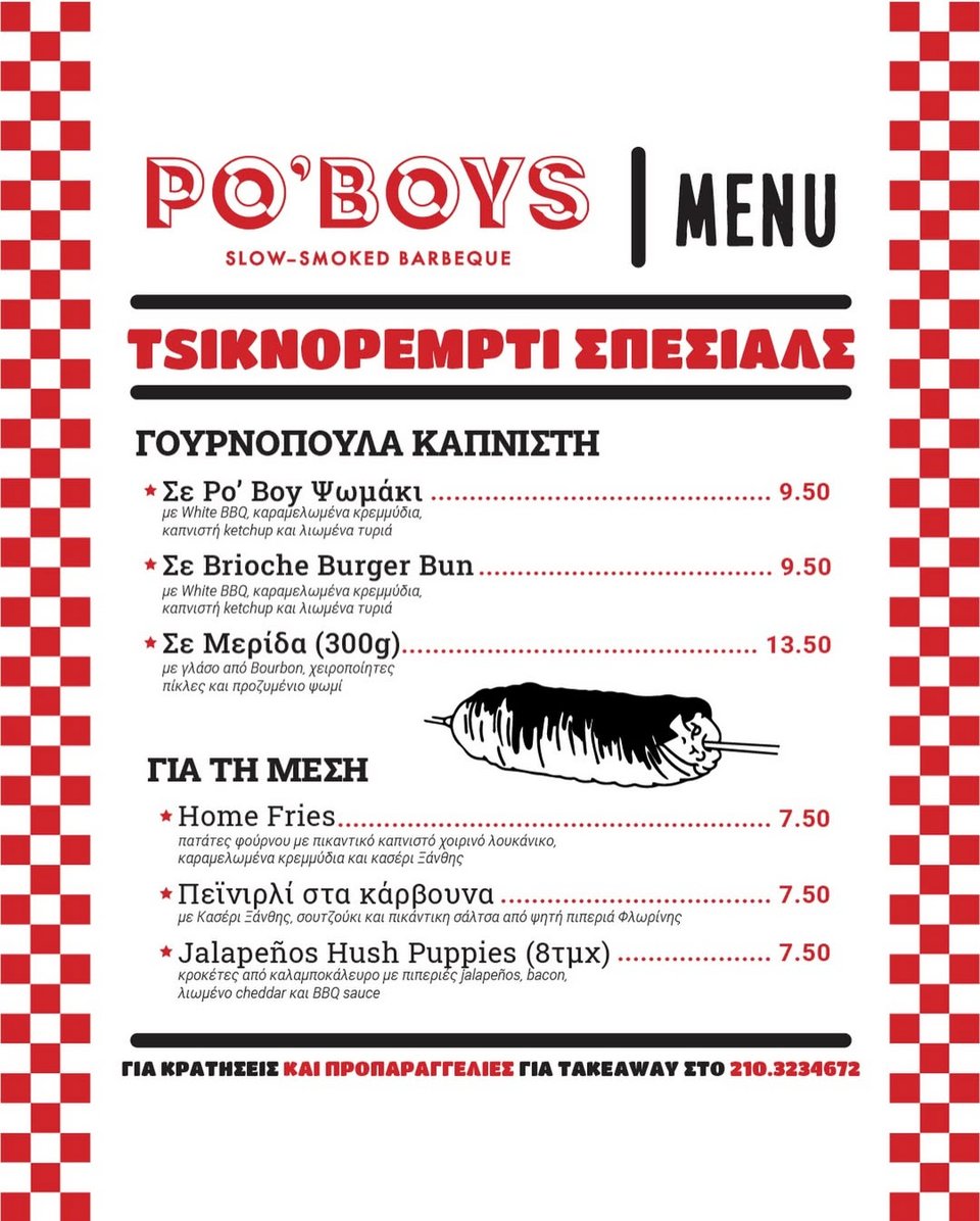 Το Po’ Boys γιορτάζει την Τσικνοπέμπτη όπως της αρμόζει: Με ένα ειδικά διαμορφωμένο μενού με σπέσιαλ μπάρμπεκιου πιάτα που θα πείσουν και τους πιο απαιτητικούς ουρανίσκους. Έτσι, θα βρεις γουρουνοπούλα καπνιστή σε ψωμάκι ή brioche burger bun (με White BBQ, καραμελωμένα κρεμμύδια, καπνιστή ketchup και λιωμένα τυριά) ή σε μερίδα (300 γρ.) με γλάσο από Bourbon, χειροποίητες πίκλες και προζυμένιο ψωμί.