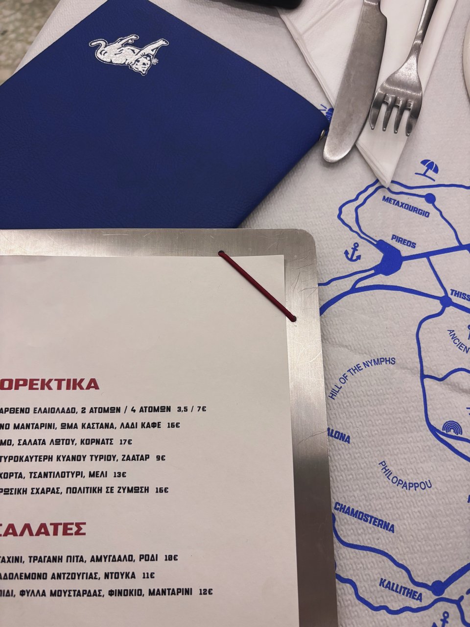 Φασολάδες με ταραμά, ρίζες και χόρτα με τσαντιλοτύρι και μέλι, λαβράκια ωμά με σαλάτες λωτού, γλώσσες μοσχαρίσιες, παλαιστινιακά κοτόπουλα και προβατίνες με ξινόχοντρο, περνούν και ξαναπερνούν από μπροστά μας για να προσγειωθούν στα γειτονικά τραπέζια και να καταναλωθούν με κέφι, ενώ από τα ηχεία παίζουν ελαφρολαϊκά, ρεμπέτικα και νέο κύμα.