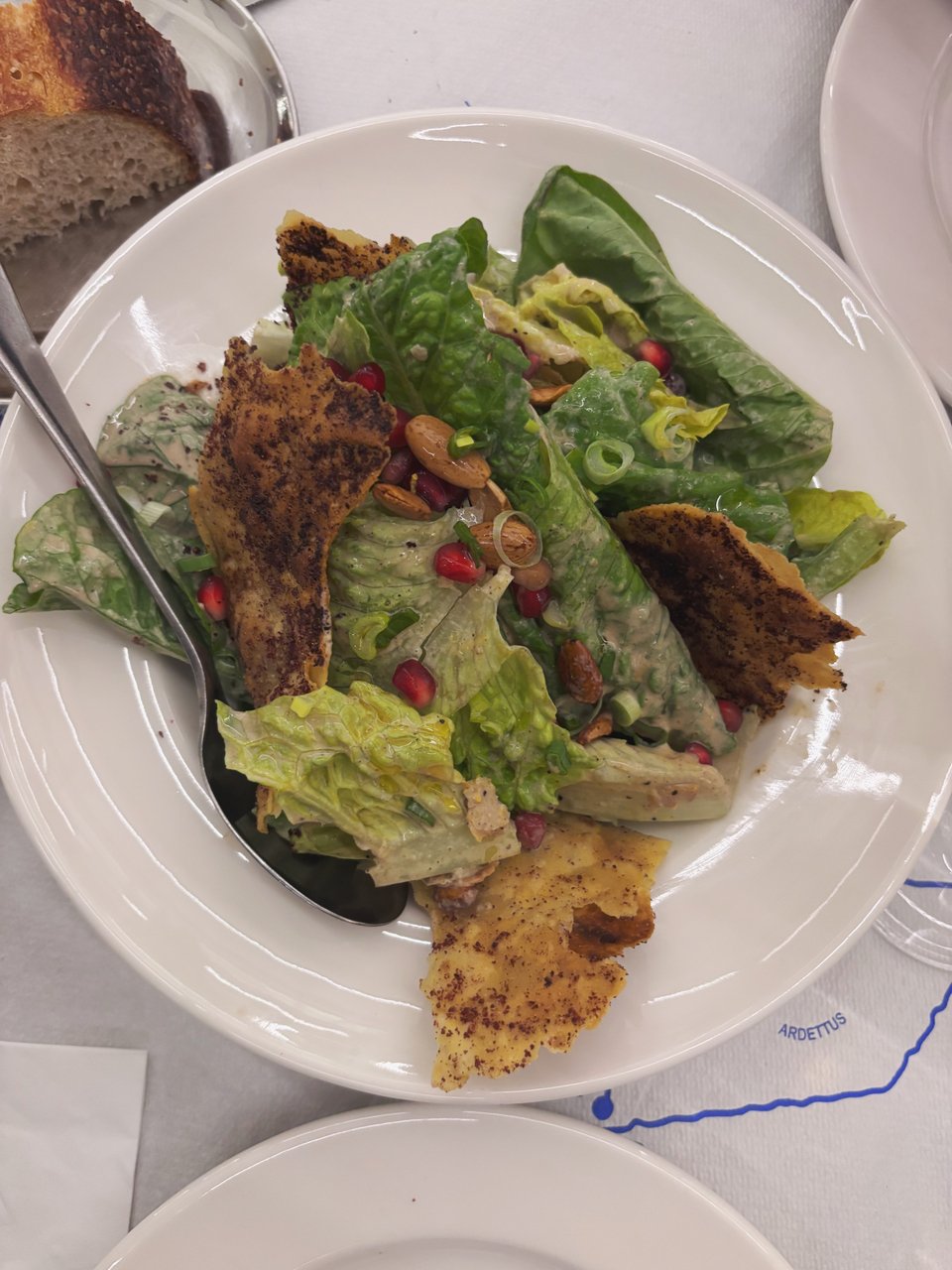 Από τις σαλάτες δοκιμάσαμε αυτή με το μαρούλι, τη σως από κεφίρ με ταχίνι, ανατολίτικη πίτα, αμύγδαλο και ρόδι. Δροσερή και πλούσια σε γεύση, με την τραγανή πιτούλα της Μέσης Ανατολής να δίνει μια χαρακτηριστική νοστιμιά και έναν έθνικ χαρακτήρα.