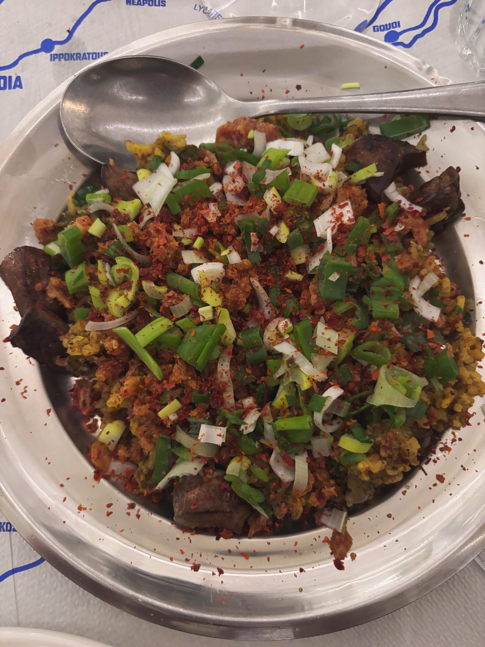 Από τα πιάτα ημέρας, δοκιμάσαμε και ένα πιάτο με καταβολές και από τη Μέση Ανατολή και τη Λεβαντίνικη κουζίνα: τα γίδινα συκωτάκια με ρύζι και μπαχαρικά. Πλούσια, πληθωρική γεύση, με τα κομμάτια από την τραγανή πέτσα του κοτόπουλου να δίνουν νοστιμιά στο ρύζι. Όμως αν δεν σας αρέσουν τα πολλά μπαχαρικά, αυτό το πιάτο δεν είναι για εσάς.