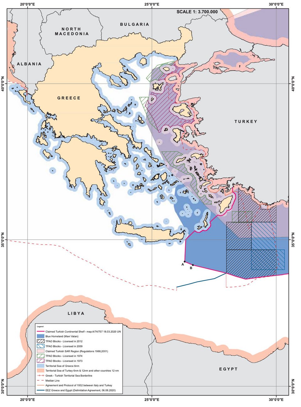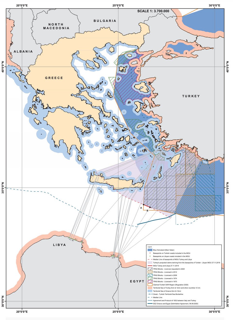 Τον Μάρτιο του 2020 (18.3.2020), η Τουρκία καταθέτει στα ΗΕ χάρτη στον οποίο εμφαίνεται, πέρα από την οριογραμμή του παράνομου τουρκολυβικού Μνημονίου, ολόκληρη η περιοχή που διεκδικεί στην Ανατολική Μεσόγειο.