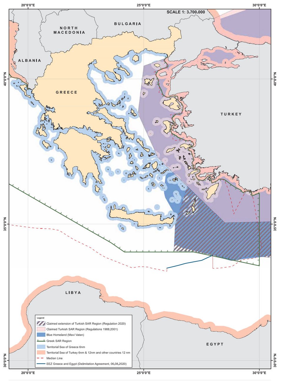 Ο χάρτης αυτός αποτυπώνει το σύνολο των τουρκικών διεκδικήσεων σήμερα, που αφορούν τόσο θέματα κυριαρχικών δικαιωμάτων (δικαιώματα επί της υφαλοκρηπίδας) όσο και θέματα δικαιοδοσιών (έρευνα και διάσωση).