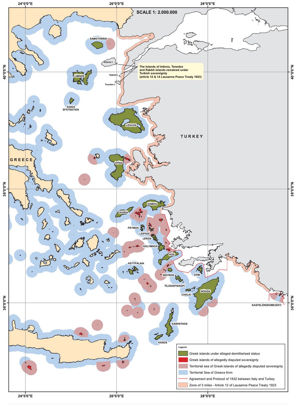 Ο εν λόγω χάρτης παρουσιάζει ενδεικτικά κάποια από τα νησιά τα οποία έχουν αμφισβητηθεί επισήμως από τουρκικές Αρχές και Τούρκους αξιωματούχους ή μέσω παραβιάσεων των χωρικών τους υδάτων από τουρκικά στρατιωτικά σκάφη ή υπερπτήσεών τους από τουρκικά μαχητικά.