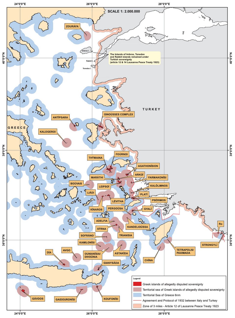 To 1923 με τη Συνθήκη Ειρήνης της Λωζάννης, η Τουρκία παραιτήθηκε από την κυριαρχία όλων των νησιών που βρίσκονται πέραν των 3 μιλίων από τις μικρασιατικές ακτές, με εξαίρεση την Ίμβρο, την Τένεδο και τις Λαγούσες Νήσους (άρθρα 12 & 16).