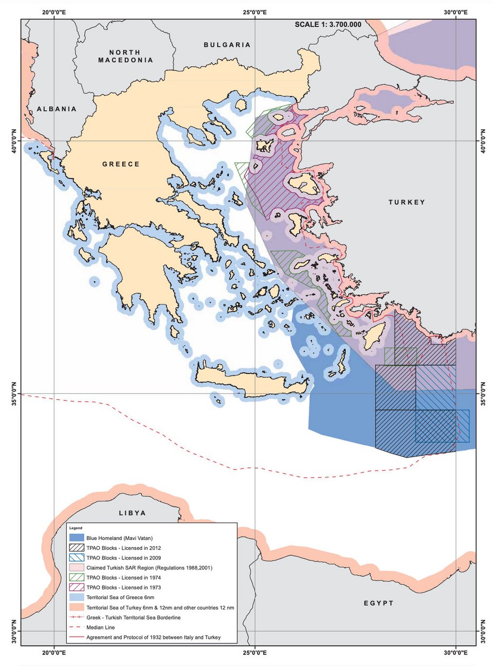 Η Τουρκία με τον χάρτη αυτόν όχι μόνο δεν αναγνωρίζει δικαίωμα υφαλοκρηπίδας των ελληνικών νησιών στη Μεσόγειο, αλλά ούτε καν δικαίωμα χωρικών υδάτων πέραν των 6 ν.μ.