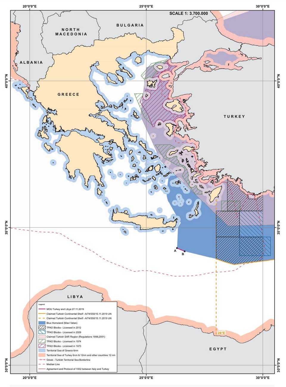 Η Τουρκία είχε δηλώσει ότι δυτικά του 28ου μεσημβρινού τα όρια της τουρκικής υφαλοκρηπίδας θα καθορισθούν με συμφωνίες μεταξύ των σχετιζόμενων κρατών. Προφανώς θεώρησε ότι η Ελλάδα δεν συγκαταλέγεται σε αυτά, καθώς 12 ημέρες αργότερα, στις 27.11.2019, υπογράφηκε το παράνομο τουρκολιβυκό Μνημόνιο, το οποίο βρίσκεται πέραν κάθε νομικής ορθότητας και γεωγραφικής πραγματικότητας, δεδομένου ότι αγνοεί την ύπαρξη ελληνικών νησιών της Δωδεκανήσου, όπως Ρόδου, Καρπάθου και Κάσσου, καθώς και της Κρήτης.