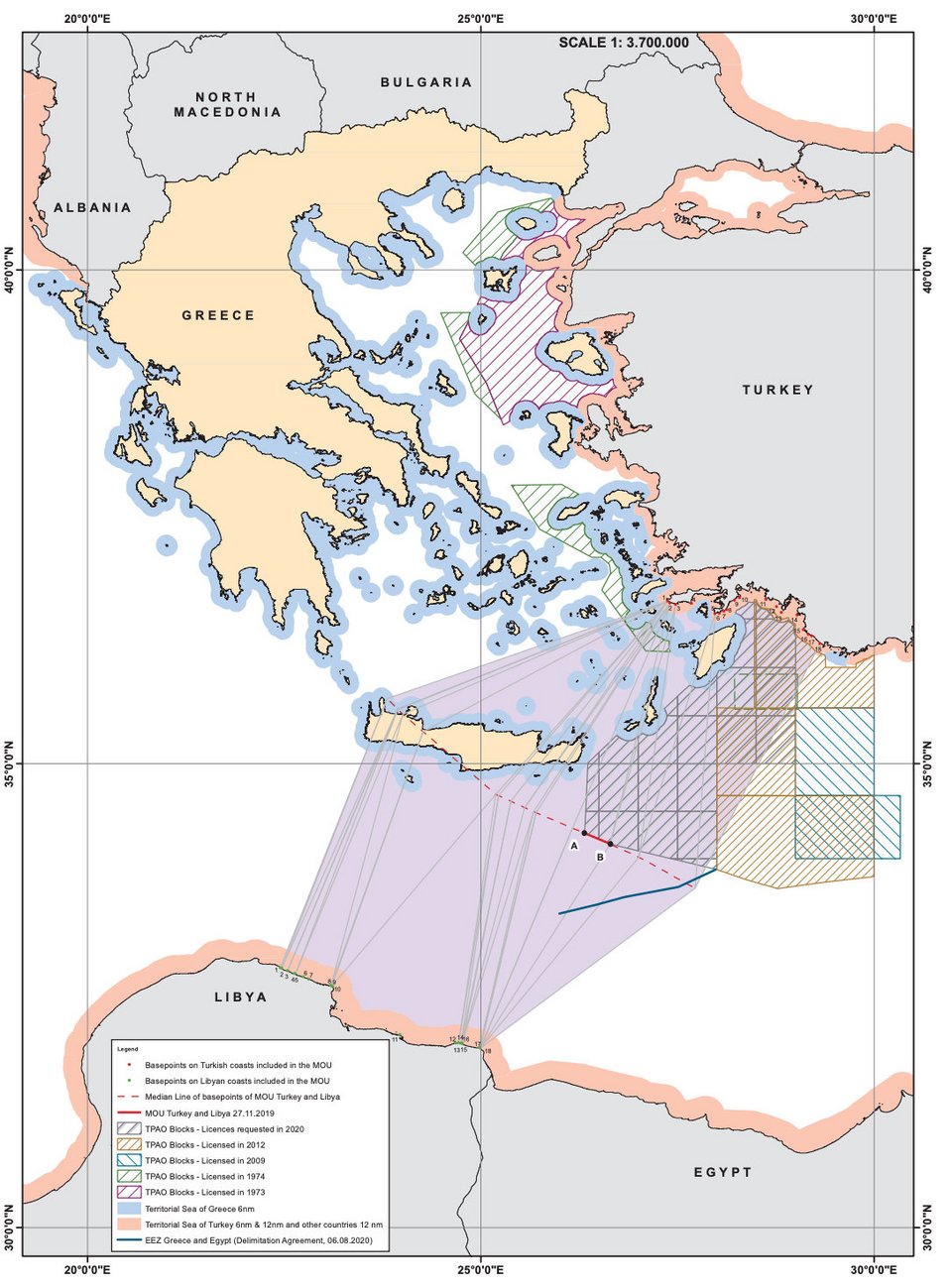 Τα εξωτερικά όρια της διεκδικούμενης περιοχής αγγίζουν τα εξωτερικά όρια των χωρικών υδάτων της Κρήτης, εφάπτονται με τα εξωτερικά όρια των χωρικών υδάτων των νησιών Κάσσου και Καρπάθου και εισέρχονται σε ελληνικά χωρικά ύδατα στην περιοχή της Ρόδου (βραχονησίδες Χήνα & Παξιμάδα).