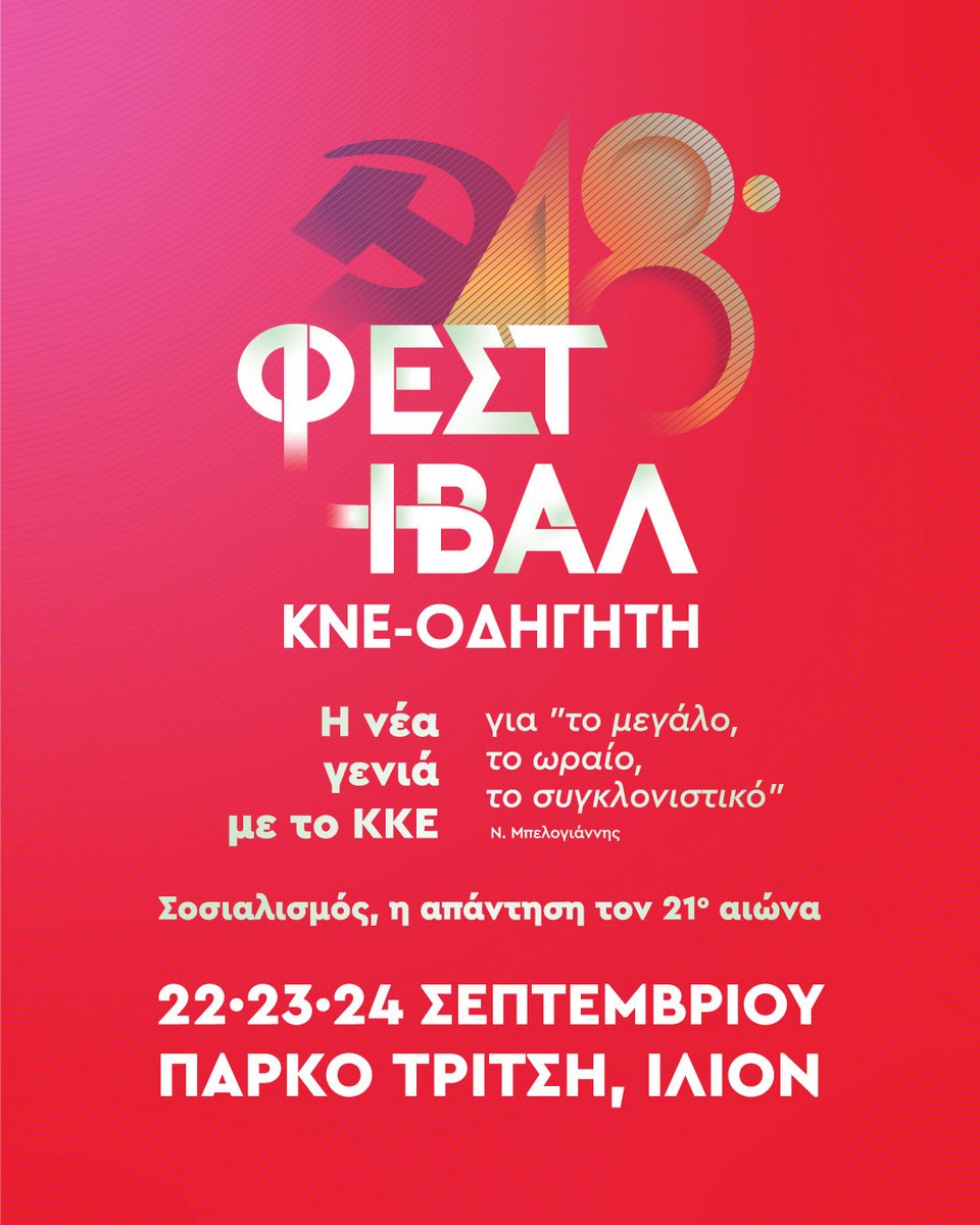 «Η νέα γενιά με το ΚΚΕ για "το μεγάλο, το ωραίο, το συγκλονιστικό" (Ν. Μπελογιάννης) - Σοσιαλισμός, η απάντηση τον 21ο αιώνα». Με αυτό το σύνθημα, εμπνευσμένο από τα λόγια του Νίκου Μπελογιάννη, που φέτος συμπληρώνονται 70 χρόνια από την εκτέλεσή του, το 48ο Φεστιβάλ ΚΝΕ-Οδηγητή «ταξιδεύει» σε όλη τη χώρα.