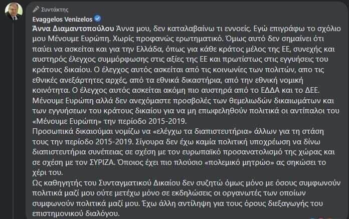«Άννα μου, δεν καταλαβαίνω τι εννοείς. Εγώ επιγράφω το σχόλιό μου Μένουμε Ευρώπη. Χωρίς προφανώς ερωτηματικό. Όμως αυτό δεν σημαίνει ότι παύει να ασκείται και για την Ελλάδα, όπως για κάθε κράτος μέλος της ΕΕ, συνεχής και αυστηρός έλεγχος συμμόρφωσης στις αξίες της ΕΕ και πρωτίστως στις εγγυήσεις του κράτους δικαίου.