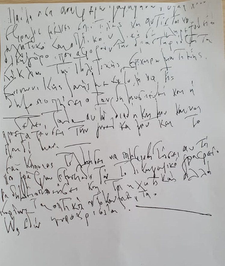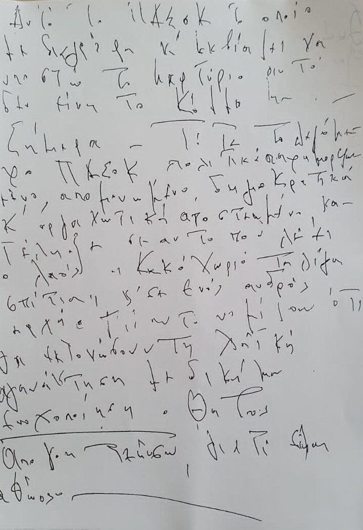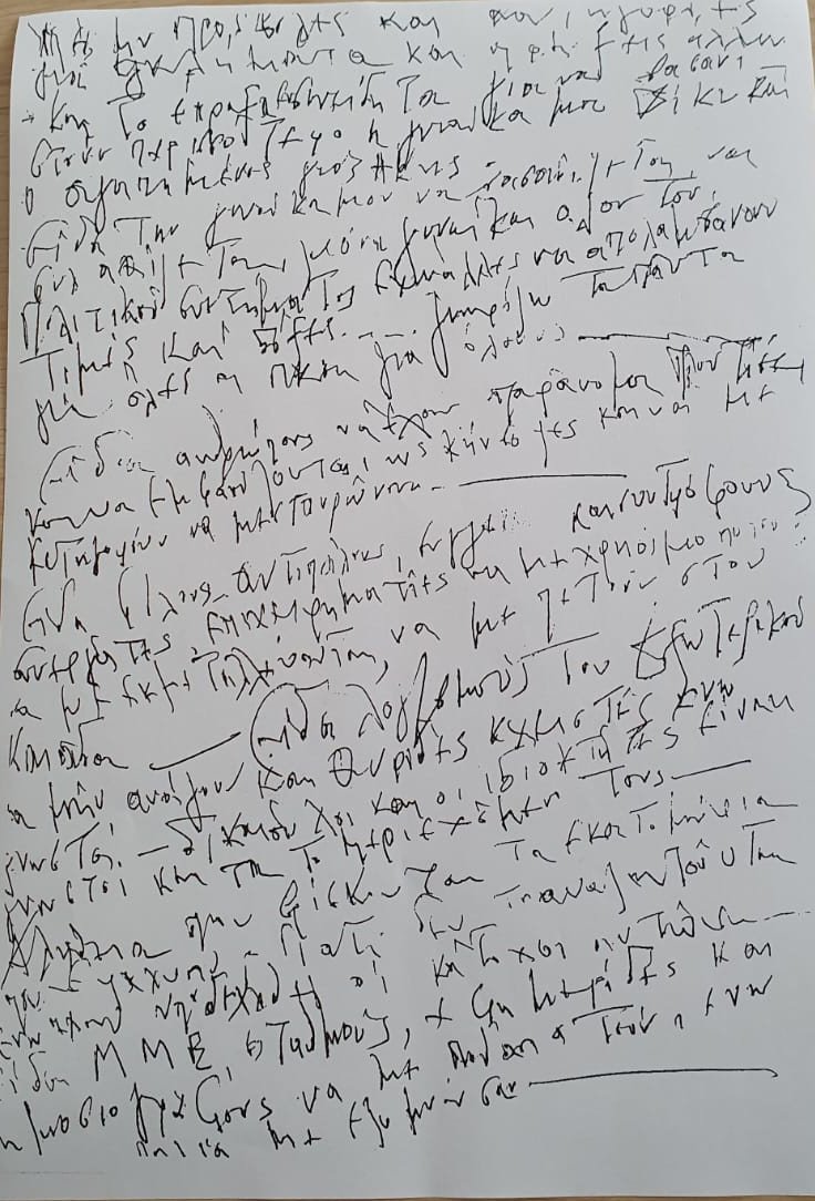 «Έχω πλήρη επίγνωση πλέον των όσων γράφω - αναφέρω - καταγγέλλω και έχουν λάβει χώρα από όλους αυτούς που εμφανίζονται υπεράνω. Έχω βιώσει την ασέβεια, τον φθόνο, το μίσος, την ασπλαχνία και την κακία των ανθρώπων. Έχω βεβαιότητα για τον λόγο που βασανίστηκα και αιχμαλωτίστηκα και εγώ και η οικογένειά μου. Χρησιμοποιηθήκαμε για να ξεπλυθούν οι αμαρτίες πολλών. Ζητώ συγγνώμη από την οικογένειά μου».