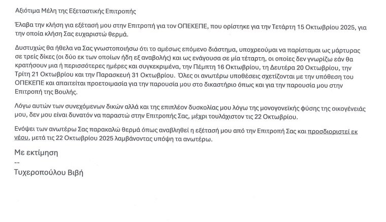 Η επιστολή στην Εξεταστική Επιτροπή του ΟΠΕΚΕΠΕ