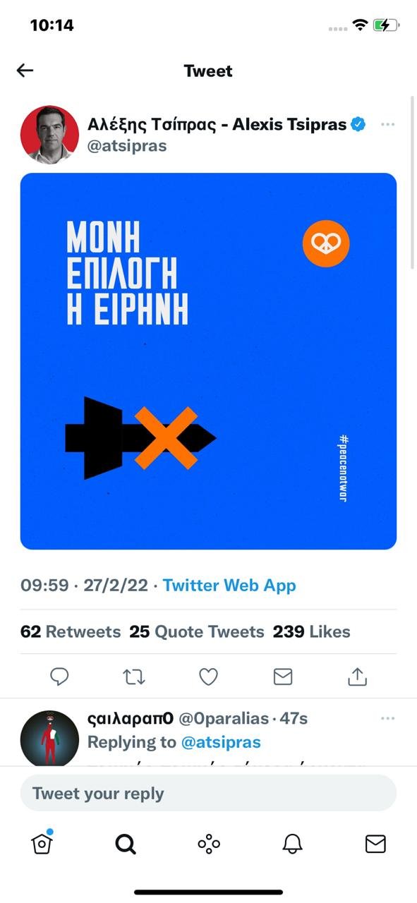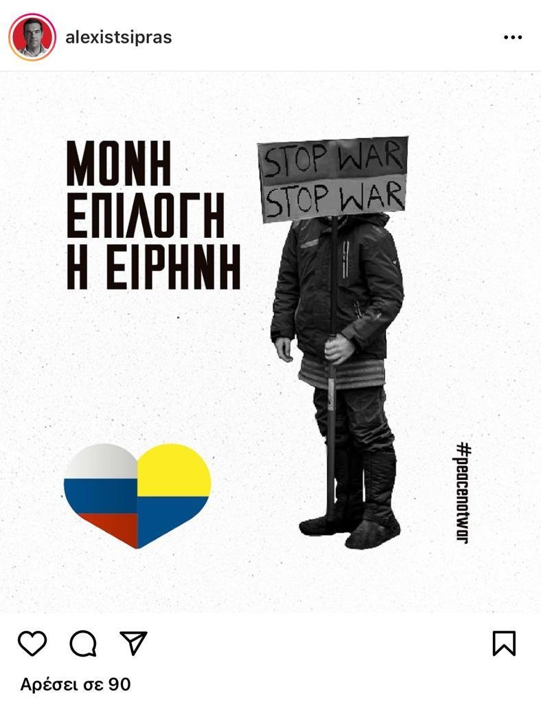 Με σύνθημα «Μόνη επιλογή η ειρήνη», ένα πανό που γράφει «No war» και ένα «απαγορευτικό» στις βόμβες, ο κ. Τσίπρας τοποθετήθηκε σήμερα, με δύο αναρτήσεις για την ρωσική εισβολή στην Ουκρανία. Απέφυγε, ωστόσο, να καταδικάσει, ρητά, στις αναρτήσεις του, την ρωσική επιθετικότητα και εισβολή σε ξένη χώρα. Μάλιστα, στην πρώτη του ανάρτηση είχε μια καρδιά, με τις σημαίες της Ρωσίας και της Ουκρανίας μαζί, κίνηση που σχολιάστηκε αρνητικά, για τις ίσες αποστάσεις μεταξύ θύτη και θύματος. Κάποιοι σχολίασαν, μάλιστα, ότι στην ανάρτηση είχε τοποθετηθεί ανάποδα η σημαία της Ουκρανίας!