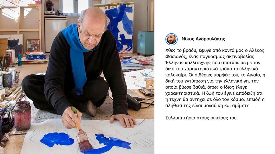Χθες το βράδυ, έφυγε από κοντά μας ο Αλέκος Φασιανός, ένας παγκόσμιας ακτινοβολίας Έλληνας καλλιτέχνης που αποτύπωσε με τον δικό του χαρακτηριστικό τρόπο το ελληνικό καλοκαίρι. Οι αιθέριες μορφές του, το Αιγαίο, η δική του εντύπωση για την ελληνική γη, την οποία βίωσε βαθιά, όπως ο ίδιος έλεγε χαρακτηριστικά. Η ζωή του έγινε απόδειξη ότι η τέχνη θα αντηχεί σε όλο τον κόσμο, επειδή η αλήθεια της είναι μοναδική και αμίμητη.