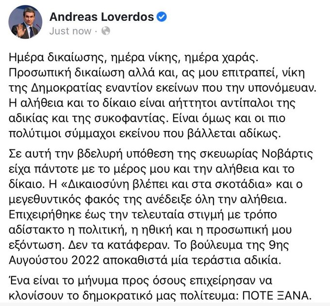 Σε αυτή την βδελυρή υπόθεση της σκευωρίας Νοβάρτις είχα πάντοτε με το μέρος μου και την αλήθεια και το δίκαιο. Η 'Δικαιοσύνη βλέπει και στα σκοτάδια' και ο μεγεθυντικός φακός της ανέδειξε όλη την αλήθεια. Επιχειρήθηκε έως την τελευταία στιγμή με τρόπο αδίστακτο η πολιτική, η ηθική και η προσωπική μου εξόντωση. Δεν τα κατάφεραν. Το βούλευμα της 9ης Αυγούστου 2022 αποκαθιστά μία τεράστια αδικία.