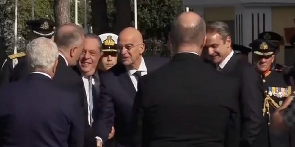 Οι κ. Μητσοτάκης και Δένδιας είχαν θερμή χειραψία και μια συνομιλία που διήρκεσε περίπου 10 λεπτά.