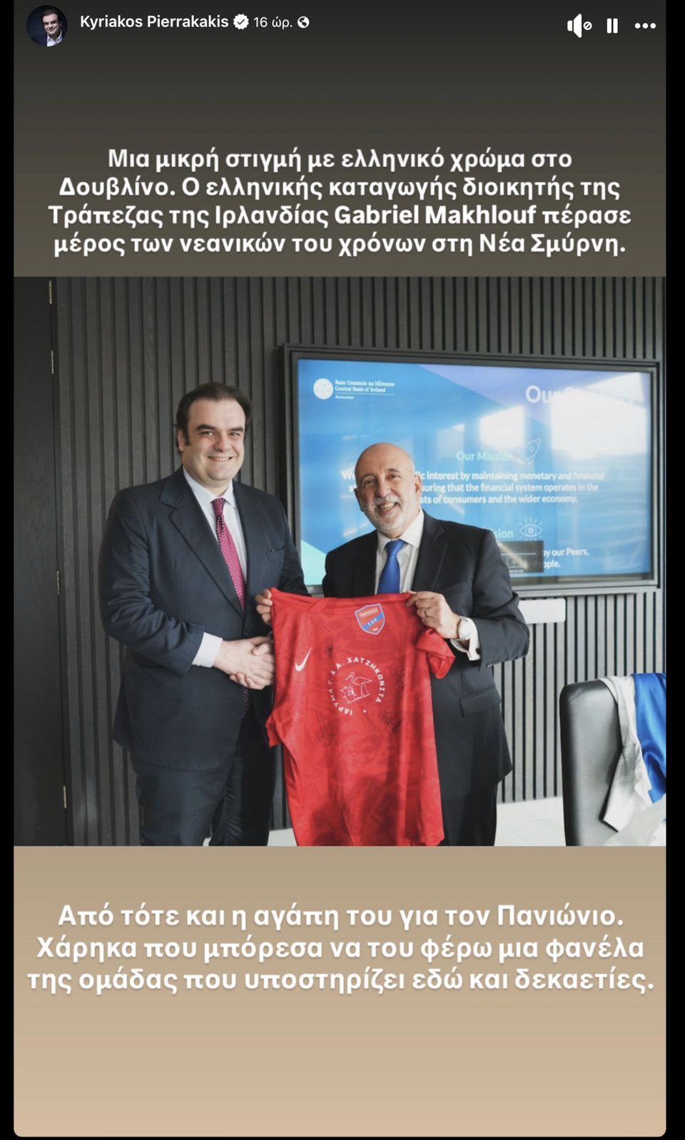 Σε story που ανέβασε ο Κυριάκος Πιερρακάκης στα social media έχει αναρτήσει μία φωτογραφία στην οποία δίνει δώρο στον Gabriel Makhlouf μία εμφάνιση της ομάδας του Πανιωνίου! Η εικόνα προκάλεσε εύλογα ερωτήματα, ωστόσο ο Κ. Πιερρακάκης έσπευσε να διευκρινίσει.