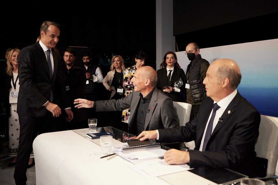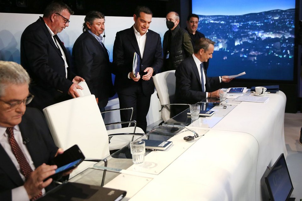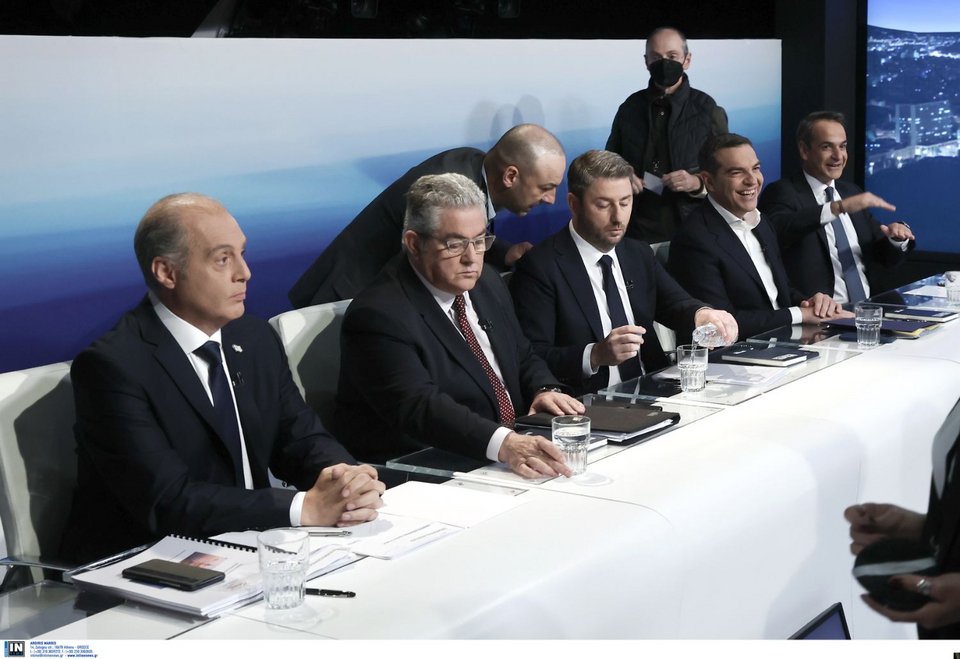 Κυριάκος Μητσοτάκης, Αλέξης Τσίπρας, Νίκος Ανδρουλάκης, Δημήτρης Κουτσούμπας, Γιάνης Βαρουφάκης και Κυριάκος Βελόπουλος κάθονταν εξ αριστερών του συντονιστή Γιώργου Κουβαρά, και εκ δεξιών του βρισκόταν το πάνελ των δημοσιογράφων, οι Μάρα Ζαχαρέα (STAR), Σία Κοσιώνη (ΣΚΑΪ), Γιώργος Παπαδάκης (ΑΝΤ1), Αντώνης Σρόιτερ (ALPHA), Παναγιώτης Στάθης (OPEN) και Ράνια Τζίμα (MEGA).