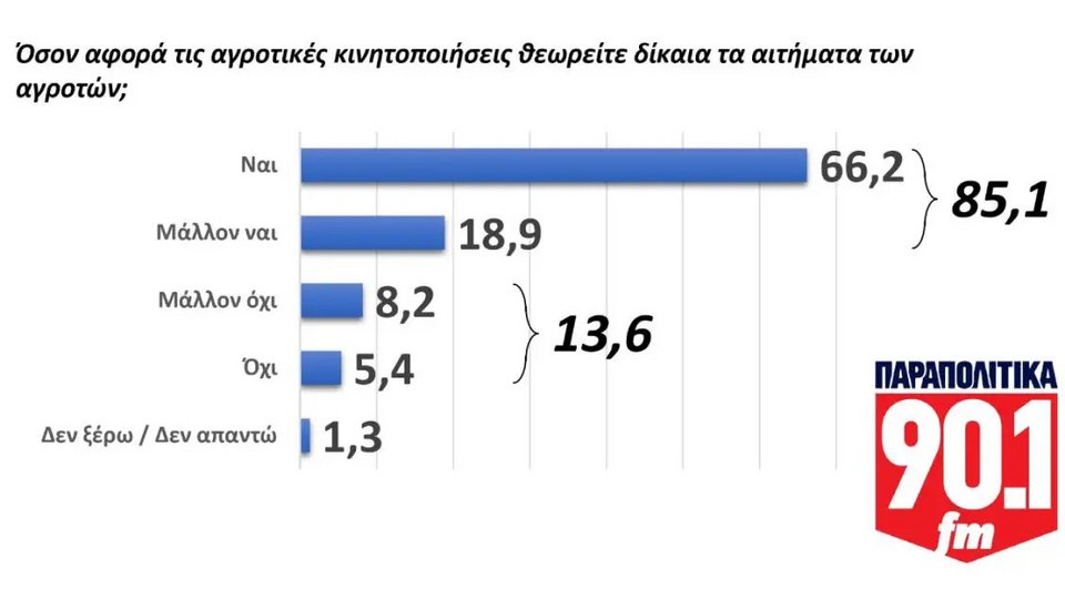 Στο κορυφαίο ζήτημα των τελευταίων ημερών, αυτό των αγροτικών κινητοποιήσεων, ένα πολύ σημαντικό ποσοστό, της τάξης του 85,1%, θεωρεί δίκαια τα αιτήματα του αγροτικού κόσμου. Ίσως, όμως, πιο σημαντικό εύρημα είναι το 64,8% που δικαιολογεί τη μορφή των κινητοποιήσεων, που περιλαμβάνουν και το κλείσιμο των Εθνικών Οδών. Σε αυτή τη φάση, οι αγροτικές διεκδικήσεις φαίνεται να έχουν την ανοχή της υπόλοιπης ελληνικής κοινωνίας, η οποία, σε συνδυασμό με όλα όσα αποκαλύπτονται γύρω από το σκάνδαλο του ΟΠΕΚΕΠΕ, αναγνωρίζει το δίκιο των κινητοποιήσεων και τοποθετείται φιλικά απέναντι στα αιτήματα του αγροτικού κόσμου.