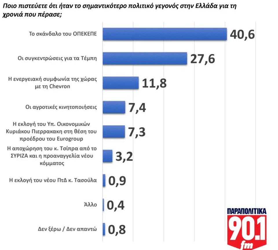 Αντίστοιχα για την Ελλάδα ξεχώρισαν την υπόθεση του ΟΠΕΚΕΠΕ (40,6%), τις πανελλαδικές συγκεντρώσεις για τα Τέμπη (27,6%), τις ενεργειακές συμφωνίες που υπέγραψε η χώρα (11,8%), τις αγροτικές κινητοποιήσεις (7,4%) και την πρόσφατη εκλογή του Έλληνα υπουργού Οικονομικών στη θέση του προέδρου του Eurogroup (7,3%).
