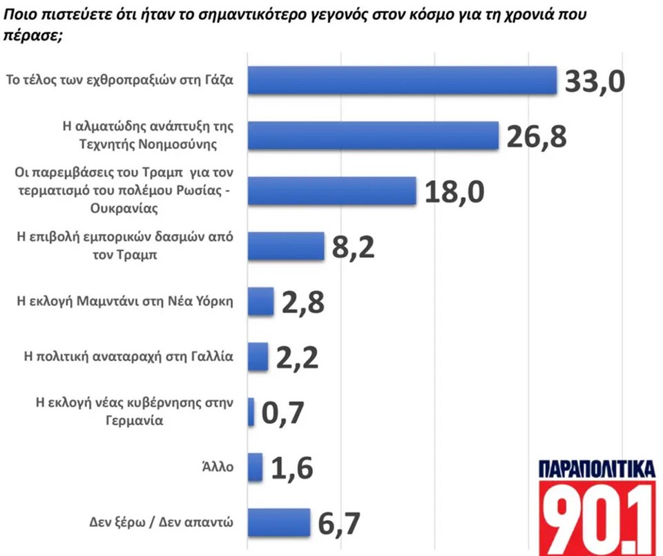 Όσον αφορά τα σημαντικότερα γεγονότα στον κόσμο για τη χρονιά που φεύγει, οι ερωτώμενοι επέλεξαν το τέλος των εχθροπραξιών στη Γάζα (33%), την αλματώδη ανάπτυξη της τεχνητής νοημοσύνης (26,8%), τις παρεμβάσεις του Τραμπ για τον τερματισμό του πολέμου στην Ουκρανία (18%) και την επιβολή εμπορικών δασμών από τις ΗΠΑ (8,2%).