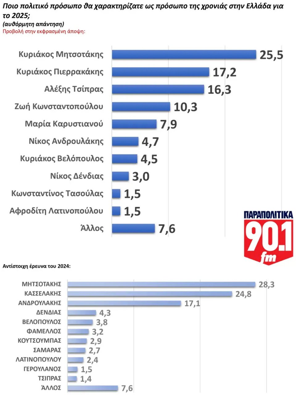 Ως το κορυφαίο πολιτικό πρόσωπο αναδεικνύεται για δεύτερη συνεχή χρονιά ο πρωθυπουργός Κυριάκος Μητσοτάκης, με 25,5%, ακολουθούμενος από τον Κυριάκο Πιερρακάκη με 17,2%, τον Αλέξη Τσίπρα με 16,3%, τη Ζωή Κωνσταντοπούλου με 10,3% και τη Μαρία Καρυστιανού με 7,9%.