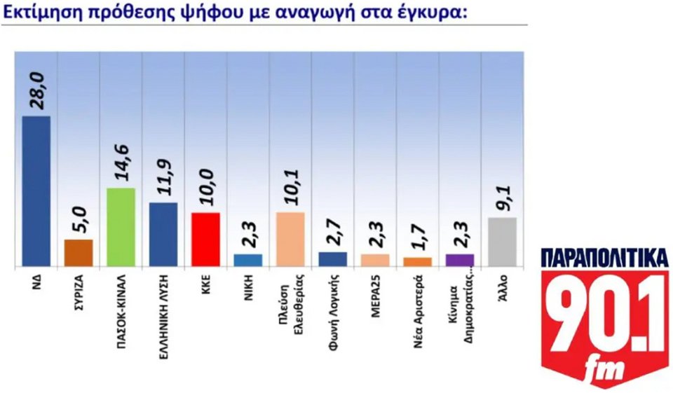 Στην εκτίμηση ψήφου με αναγωγή στα έγκυρα, η ΝΔ παραμένει πρώτη με 28% και ακολουθεί το ΠΑΣΟΚ με 14,6%.