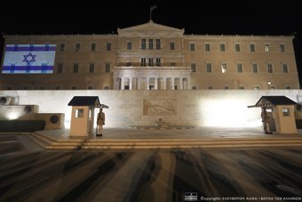 Με τη σημαία του Ισραήλ φωταγωγήθηκε το κτίριο της Βουλής των Ελλήνων, σε ένδειξη συμπαράστασης προς τον ισραηλινό λαό για τις τρομοκρατικές επιθέσεις της Χαμάς.
