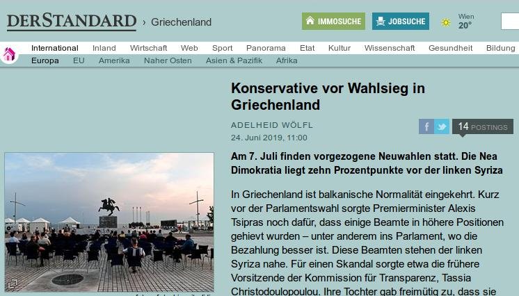 Στο ρουσφετολογικό όργιο της κυβέρνησης ΣΥΡΙΖΑ παραμονές των εκλογών και τη διαγραφόμενη νίκη της Νέας Δημοκρατίας αναφέρεται η Der Standard σημειώνοντας ότι η κρίσιμη αναμέτρηση της 7ης Ιουλίου θα κριθεί σε μεγάλο βαθμό από τη συμμετοχή και την αντίδραση της μεσαίας τάξης, ενώ ρόλο θα παίξει και το μακεδονικό.