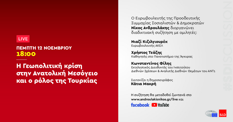Διαδικτυακή εκδήλωση με θέμα τη Γεωπολιτική κρίση στην Ανατολική Μεσόγειο και το ρόλο της Τουρκίας διοργανώνει ο Ευρωβουλευτής Νίκος Ανδρουλάκης.
