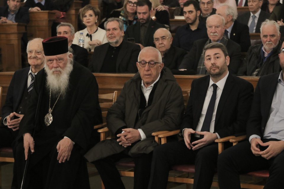 Στην πρώτη σειρά από αριστερά:Ο βουλευτής του ΠΑΣΟΚ Πάρις Κουκουλόπουλος, η βουλευτής Ευαγγελία Λιακούλη, ο πρώην πρόεδρος της Βουλής Απόστολος Κακλαμάνης, ο Αρχιεπίσκοπος Ιερώνυμος, ο πρόεδρος της Βουλής Νικήτας Κακλαμάνης, ο πρόεδρος του ΠΑΣΟΚ Νίκος Ανδρουλάκης, ο γραμματέας του ΠΑΣΟΚ Ανδρέας Σπυρόπουλος και ο πρώην βουλευτής του ΣΥΡΙΖΑ Κώστας Ζαχαριάδης