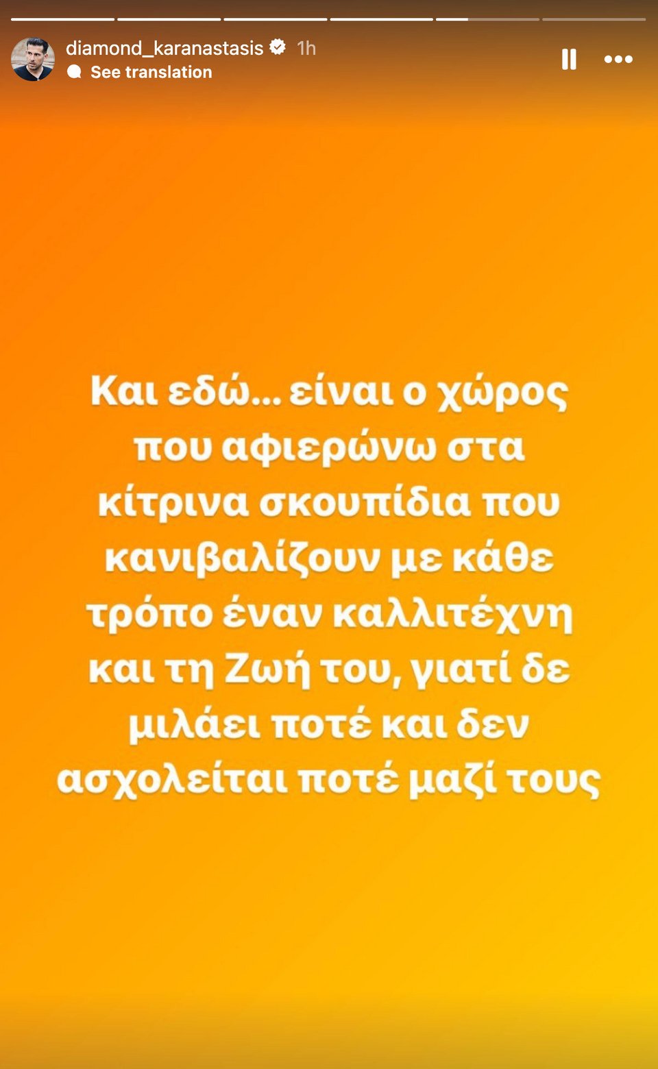 Σε άλλο του story στο Instagram γράφει με νόημα: «Και εδώ... είναι ο χώρος που αφιερώνω στα κίτρινα σκουπίδια που κανιβαλίζουν με κάθε τρόπο έναν καλλιτέχνη και τη Ζωή του, γιατί δεν μιλάει ποτέ και δεν ασχολείται ποτέ μαζί τους».
