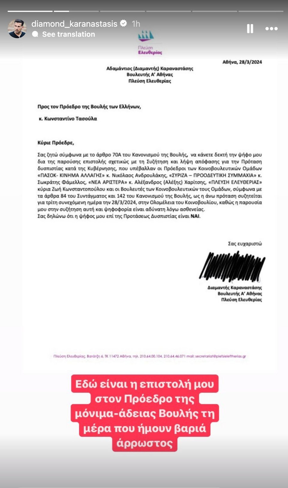 Ακολούθως πόσταρε την επιστολή του στον πρόεδρο της Βουλής, μέσω της οποίας ανέφερε ότι έπρεπε να λείπει κατά την ψηφοφορία γιατί ήταν άρρωστος και ότι ψηφίζει υπέρ της πρότασης δυσπιστίας.