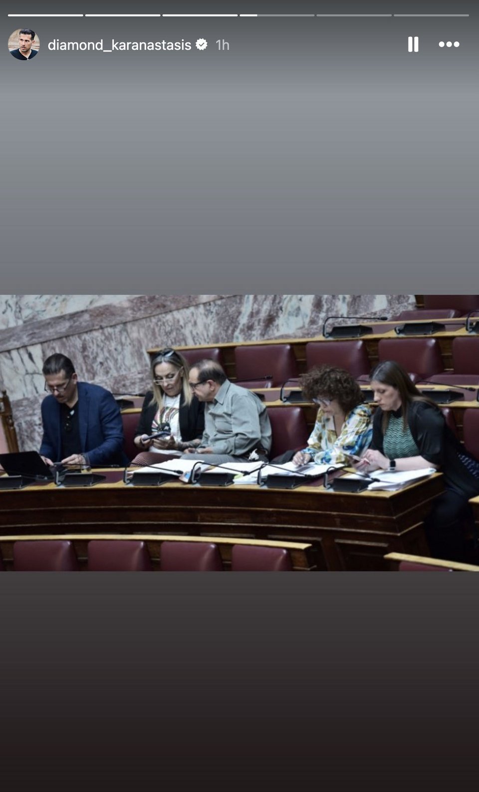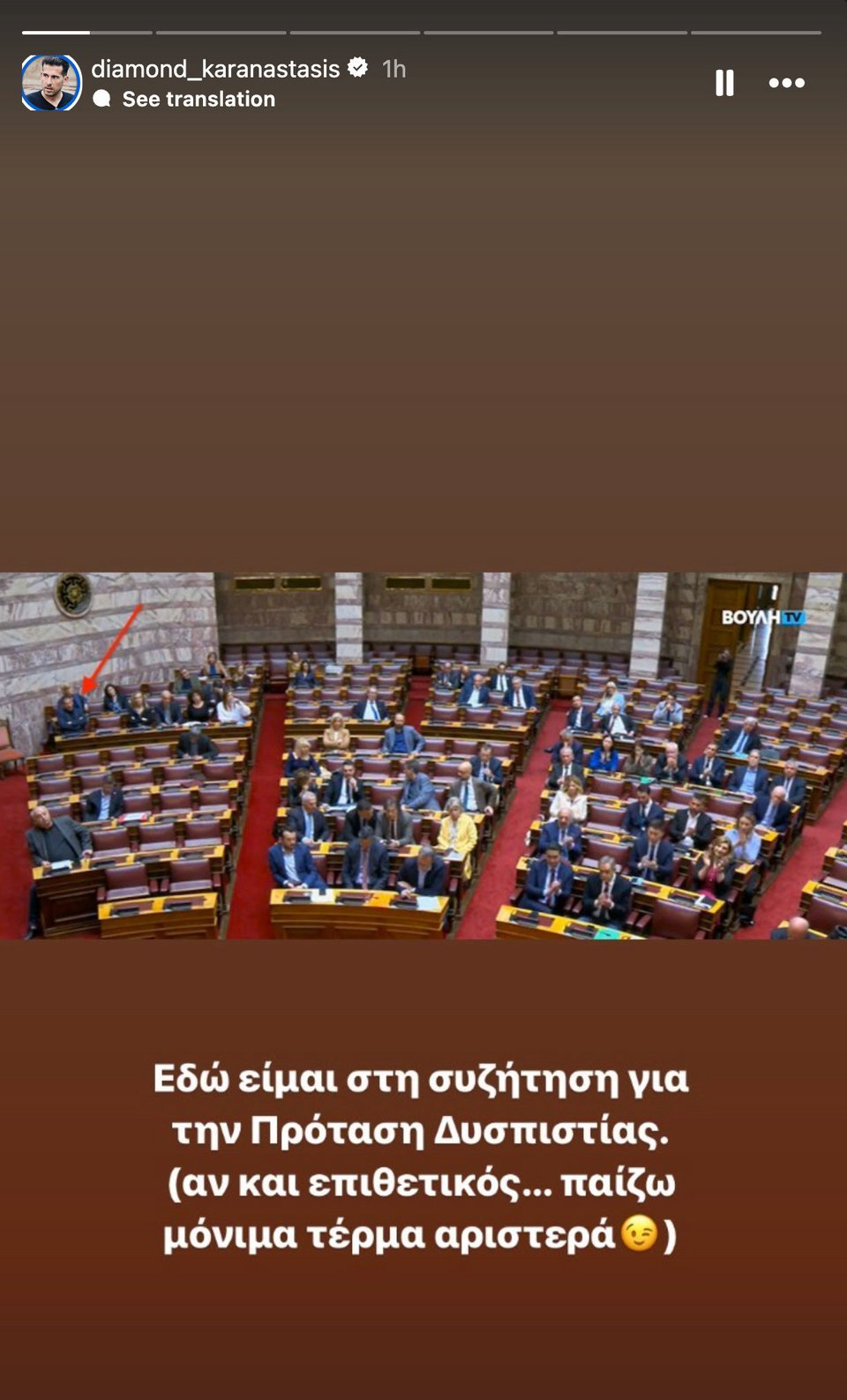 Ακολούθως πόσταρε μια σειρά από φωτό του στις οποίες απεικονίζεται τις επόμενες -της πρότασης δυσπιστίας- ημέρες στη Βουλή, γράφοντας: «Εδώ είναι μια από τις ολομέλειες της μόνιμα-άδειας Βουλής που συμμετείχα τις επόμενες μέρες, μέσα στην τεράστια πίεση επαγγελματικών και πολιτικών υποχρεώσεων (ομιλία Ζωής)».