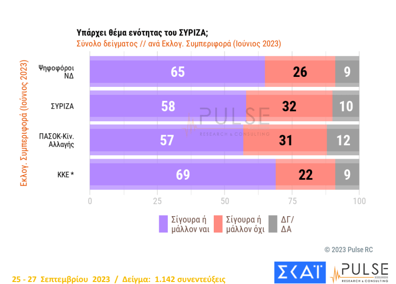 Επίσης, σχεδόν 6 στους 10 ερωτηθέντες -τόσο στο γενικό κοινό όσο και ψηφοφόροι του ΣΥΡΙΖΑ- εκτιμούν ότι υπάρχει θέμα διάσπασης του κόμματος.