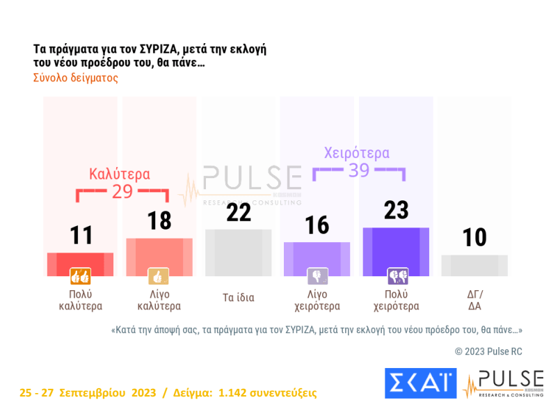 Εξάλλου, το 39% πιστεύει ότι τα πράγματα για τον ΣΥΡΙΖΑ θα πάνε χειρότερα με την εκλογή Κασσελάκη, έναντι 29 που εκτιμά το αντίθετο.
