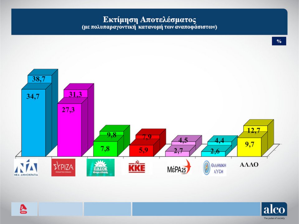Σύμφωνα με την εκτίμηση ψήφου που παρουσιάστηκε στο κεντρικό δελτίο ειδήσεων του Alpha, η Νέα Δημοκρατία βρίσκεται στην πρώτη θέση με ποσοστό 34,7% και ανώτατο όριο το 38,7%.