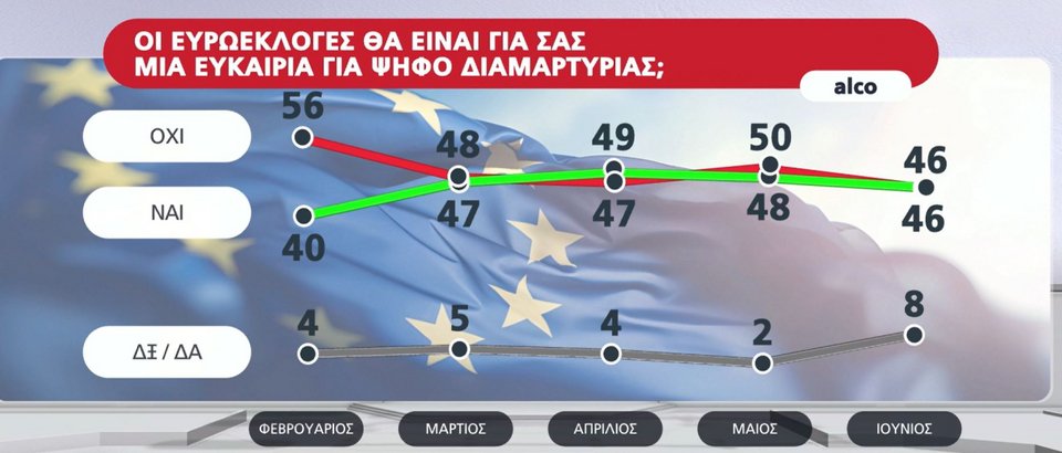 Τέλος, «ισόπαλες» αναδεικνύονται οι απαντήσεις στο ερώτημα εάν οι ευρωεκλογές συνιστούν μια ευκαιρία για ψήφο διαμαρτυρίας. «Όχι» λέει το 46%, «ναι» απαντά επίσης το 46%.