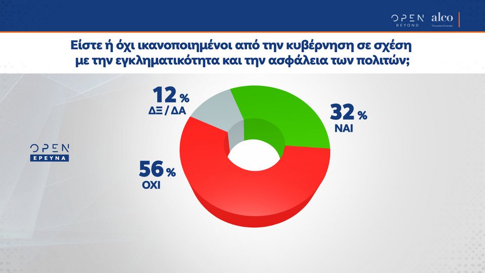 Ωστόσο, ποσοστό 56% δηλώνει πως δεν είναι ικανοποιημένο από την κυβέρνηση, αναφορικά με την ασφάλεια και την εγκληματικότητα. Στο ίδιο ερώτημα, 32% των ερωτηθέντων απαντούν πως είναι ικανοποιημένοι.