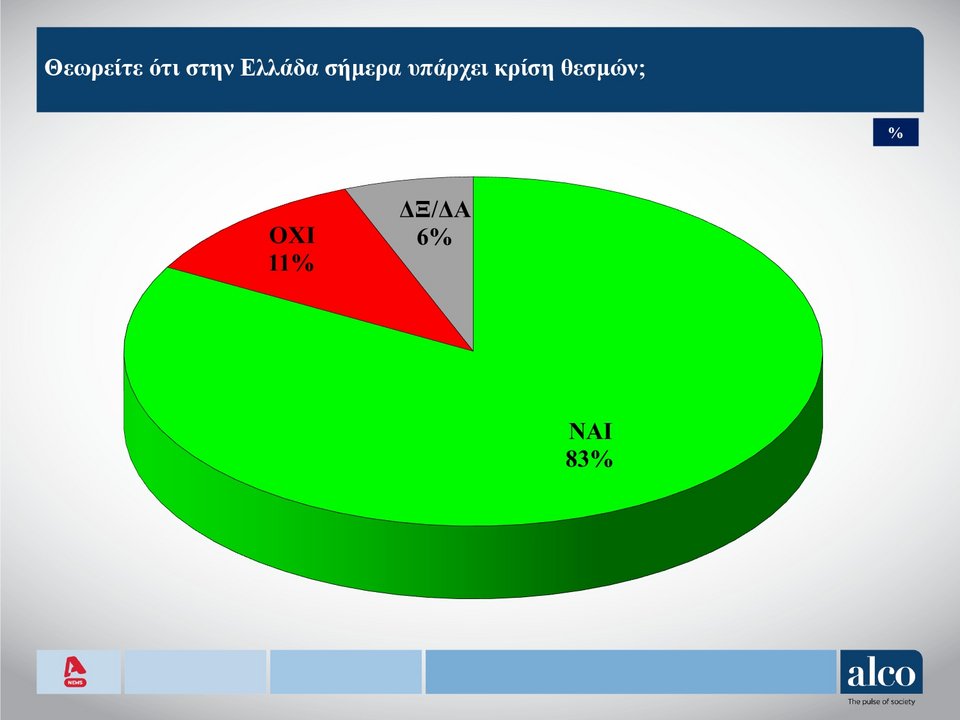 Για το αν στην Ελλάδα υπάρχει κρίση θεσμών, «ναι» λέει το 83%, ενώ το 11% έχει αντίθετη άποψη.