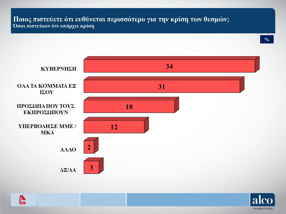 Μοιρασμένη είναι η άποψη για το ποιος ευθύνεται για τη κρίση θεσμών. Το 34% λέει η κυβέρνηση, ενώ «όλα τα κόμματα» θεωρεί πως φταίνε το 31%.