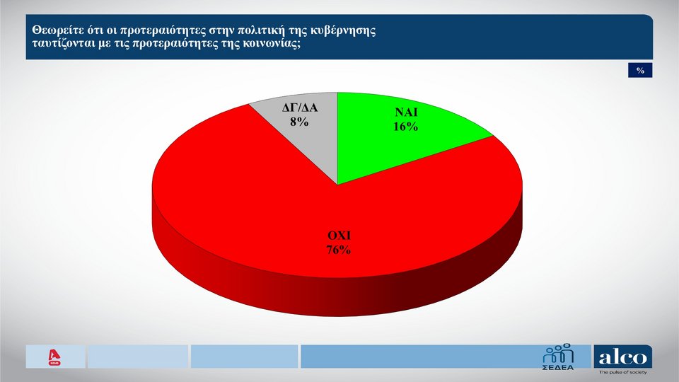 Για το 76%, οι προτεραιότητες της πολιτικής της κυβέρνησης δεν ταυτίζονται με εκείνες της κοινωνίας, ενώ το 16% εκφράζει διαφορετική άποψη.
