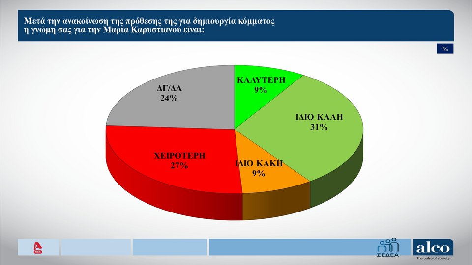 Σύμφωνα με τη δημοσκόπηση, το 31% των ερωτηθέντων δηλώνει ότι έχει το «ίδιο καλή» γνώμη για τη Μαρία Καρυστιανού μετά την ανακοίνωση της πρόθεσης για τη δημιουργία κόμματος. Το 27% λέει ότι είναι «χειρότερη», το 9% δηλώνει «καλύτερη» και το ίδιο ποσοστό απαντά το «ίδιο κακή».