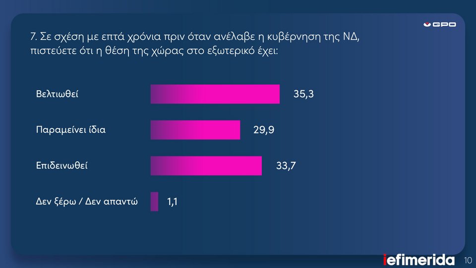 Συνολικά, η εξωτερική πολιτική της κυβέρνησης αποτιμάται θετικά από το 38,9% των πολιτών, ποσοστό που καταγράφεται ως ο υψηλότερος δείκτης των επιμέρους κυβερνητικών πολιτικών και επιβεβαιώνει ότι η εξωτερική πολιτική αποτελεί προνομιακό πεδίο για τον Έλληνα πρωθυπουργό, που συνεχίζει σε ποσοστό 31,2%, και σε μεγάλη απόσταση από τους υπόλοιπους πολιτικούς αρχηγούς, να θεωρείται ως ο καλύτερος εκπρόσωπος αυτή τη στιγμή της χώρας στα διεθνή φόρα. Θα πρέπει, βέβαια, να σημειώσουμε ότι παραδοσιακά και ιστορικά ο εκάστοτε εν ενεργεία πρωθυπουργός απολαμβάνει μιας σχετικά μεγαλύτερης εμπιστοσύνης και δέχεται πιο περιορισμένη κριτική για τα εξωτερικά σε σχέση με τα θέματα της εσωτερικής επικαιρότητας, παρ' όλα αυτά η κυριαρχία του Κ. Μητσοτάκη σε αυτόν τον τομέα είναι ισχυρή.