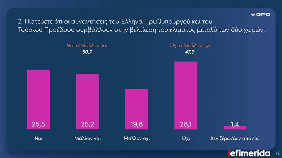 Η αλήθεια είναι ότι δεν προέκυψε κάποιο καινούργιο στοιχείο από τη συνάντηση των δύο ηγετών, το ήπιο όμως σε γενικές γραμμές κλίμα που επικράτησε φαίνεται ότι ικανοποίησε ένα σημαντικό τμήμα των πολιτών, που σε ποσοστό 50,7% πιστεύει ότι αυτές οι συναντήσεις, ακόμη κι αν δεν παράγουν εντυπωσιακά αποτελέσματα, είναι απαραίτητες και πρέπει να εξακολουθούν να γίνονται, καθώς συμβάλλουν στη βελτίωση του κλίματος μεταξύ των δύο χωρών.
