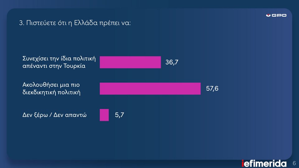 Την ίδια στιγμή, βέβαια, το 57,6% πιστεύει ότι η χώρα μας πρέπει να ακολουθήσει μια πιο διεκδικητική πολιτική έναντι της Τουρκίας, την οποία η πλειοψηφία σε ποσοστό 76,4% συνεχίζει να θεωρεί ως μια χώρα απειλητική για τα ελληνικά συμφέροντα.
